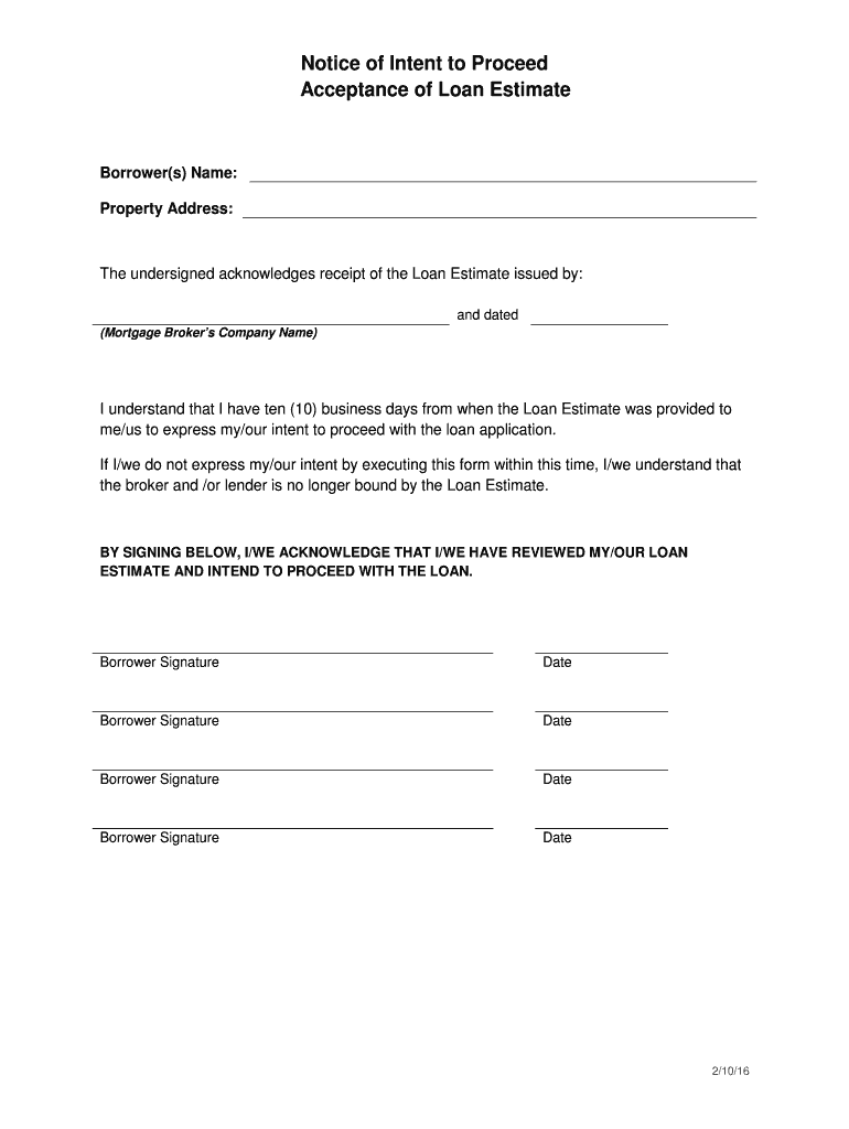 Notice of Intent to Proceed Acceptance of Loan Estimate Borrower(s) Name: Property Address: The undersigned acknowledges receipt of the Loan Estimate issued by: and dated (Mortgage Brokers Company