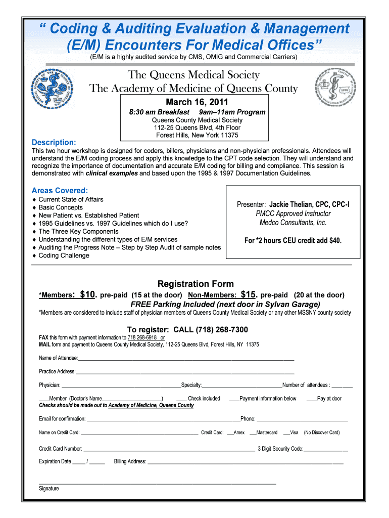 Coding & Auditing Evaluation & Management (E/M) Encounters For Medical Offices (E/M is a highly audited service by CMS, OMIT and Commercial Carriers) The Queens Medical Society The Academy of Medicine