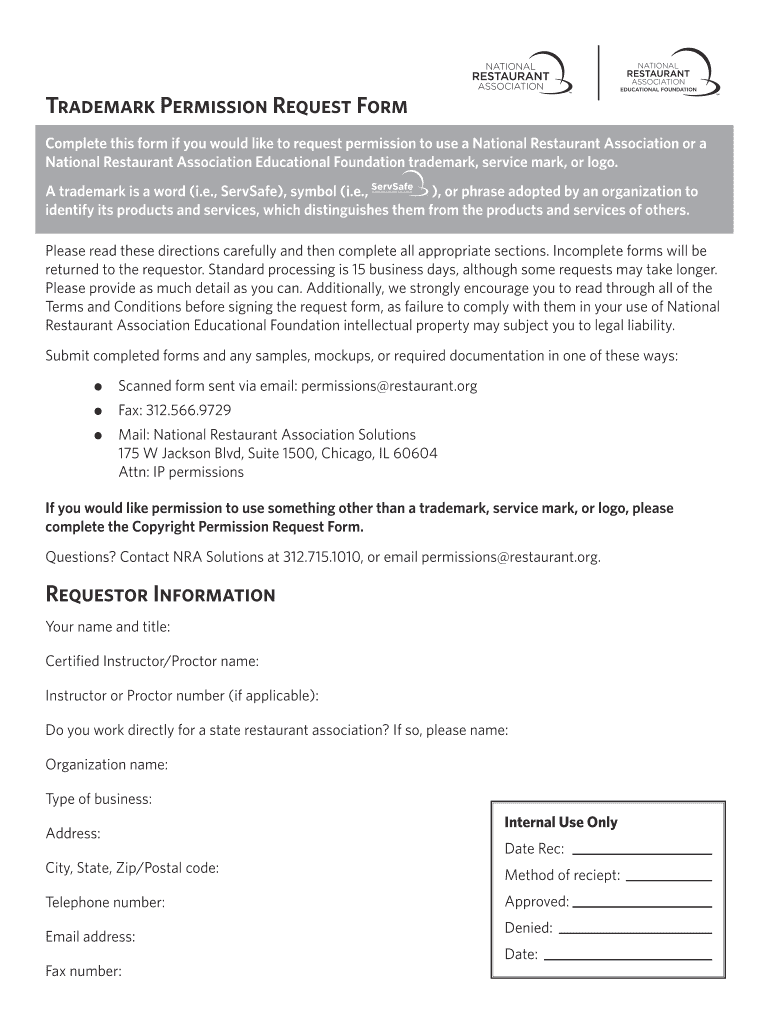Trademark Permission Request Form Complete this form if you would like to request permission to use a National Restaurant Association or a National Restaurant Association Educational Foundation trademark,