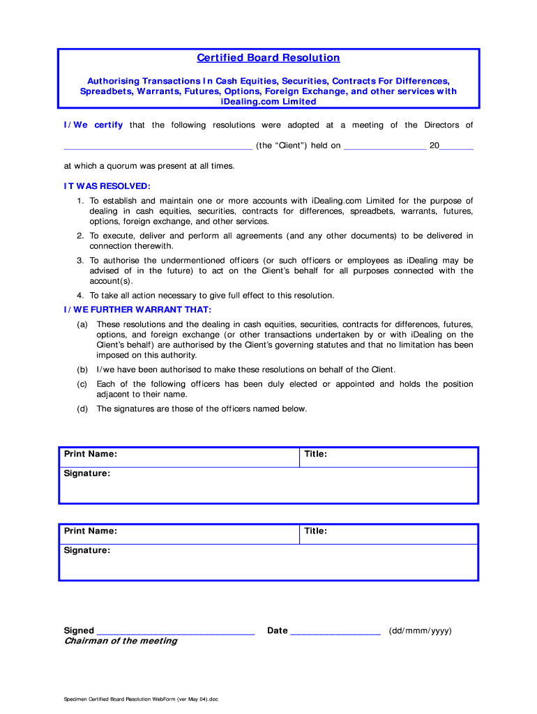 Certified Board Resolution Authorizing Transactions In Cash Equities, Securities, Contracts For Differences, Spread bets, Warrants, Futures, Options, Foreign Exchange, and other services with iDealing.com