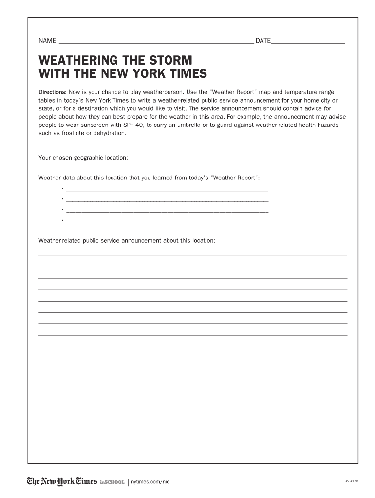 Name DATE Weathering the Storm with The New York Times Directions: Now is your chance to play weatherperson. Use the Weather Report map and temperature range tables in today's New York Times to write