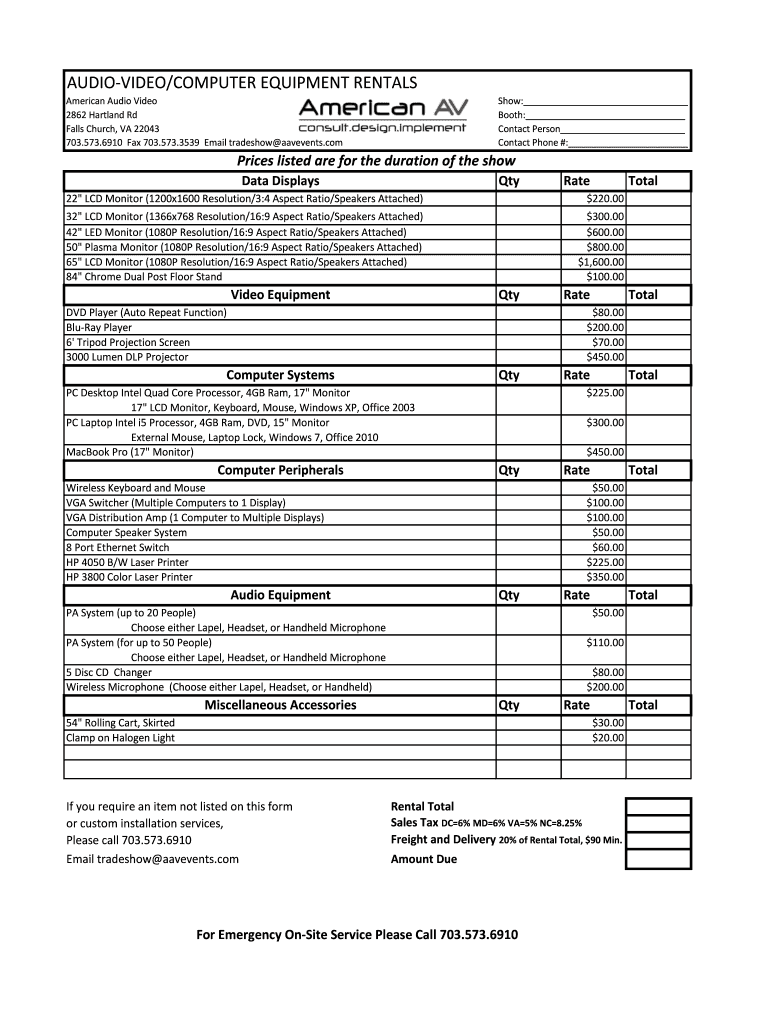 AUDIOVIDEO/COMPUTER EQUIPMENT RENTALS American Audio Video 2862 Hartland Rd Falls Church, VA 22043 703.573.6910 Fax 703.573.3539 Email trade show aavevents.com Show: Booth: Contact Person Contact