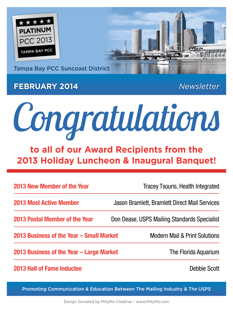 Tampa Bay PCC Sun coast District February 2014 Newsletter to all of our Award Recipients from the 2013 Holiday Luncheon & Inaugural Banquet! 2013 New Member of the Year 2013 Most Active Member 2013