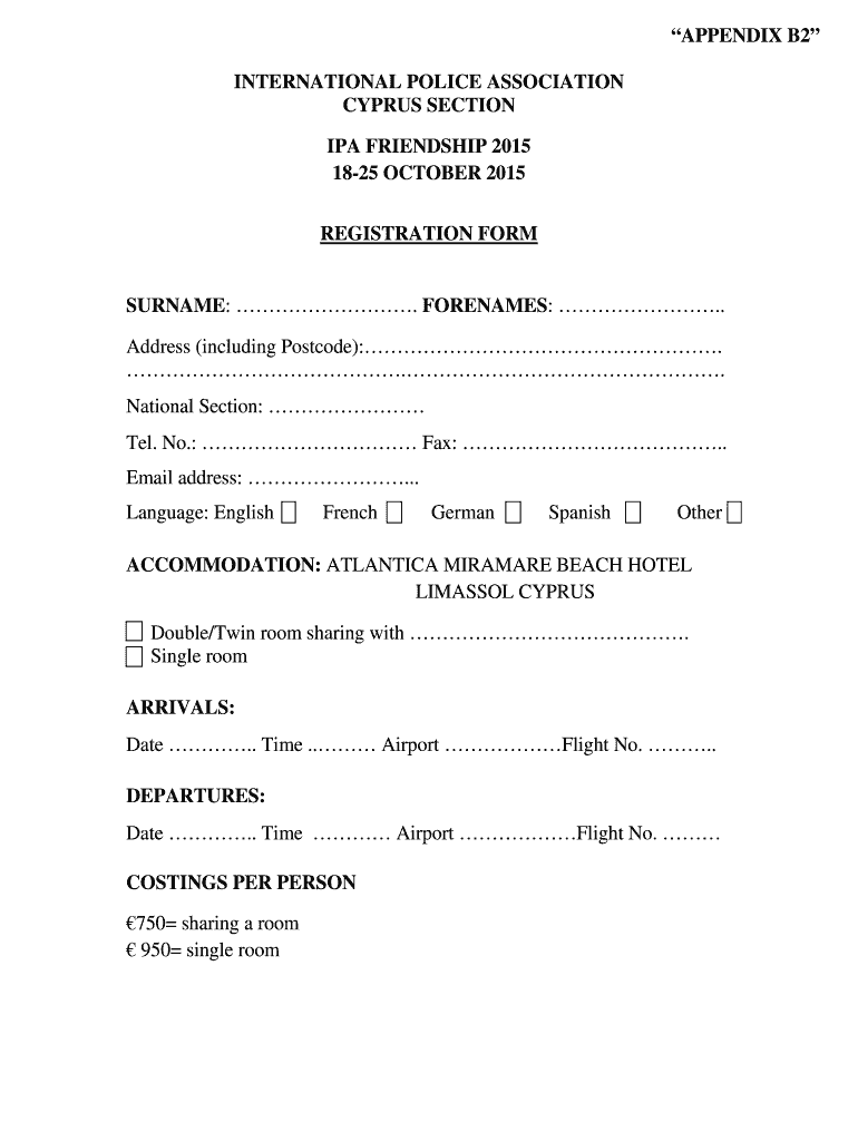 APPENDIX B2 INTERNATIONAL POLICE ASSOCIATION CYPRUS SECTION IPA FRIENDSHIP 2015 1825 OCTOBER 2015 REGISTRATION FORM SURNAME:. FORENAMES:. Address (including Postcode):. . National Section: Tel. No.: