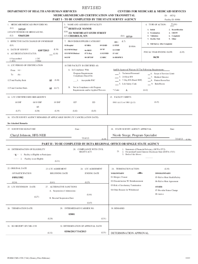 The CMS-1539 Form is a certification tool employed by the Centers for Medicare & Medicaid Services (CMS) for healthcare facility certification. It serves a critical role in the certification and recertification processes for various types of facilities, particularly skilled nursing facilities and nursing facilities. This form encompasses essential details regarding the facility's compliance, eligibility, and operational standards necessary for participation in federal programs.