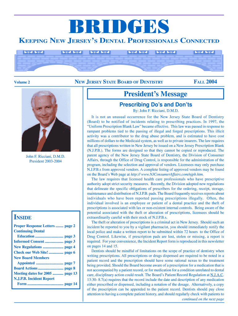 This newsletter aims to keep New Jersey's dental professionals informed about regulations, continuing education requirements, and important updates from the New Jersey State Board of Dentistry.