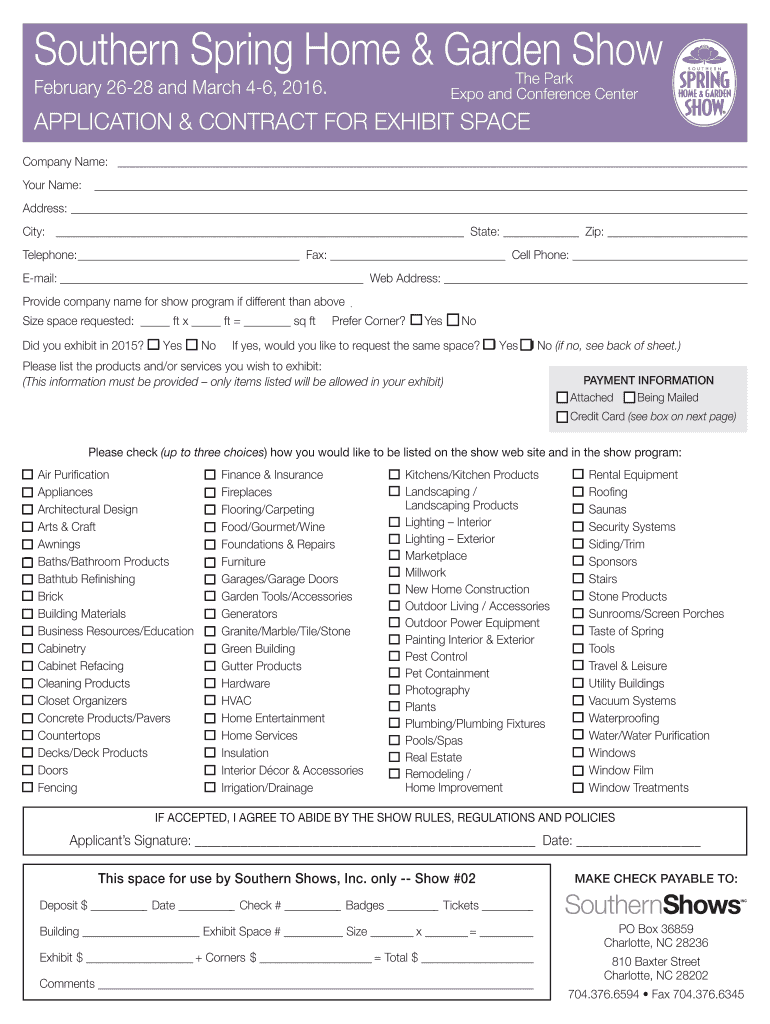 Southern Spring Home & Garden Show The Park Expo and Conference Center February 2628 and March 46, 2016. APPLICATION & CONTRACT FOR EXHIBIT SPACE Company Name: Your Name: Address: City: State: Zip:
