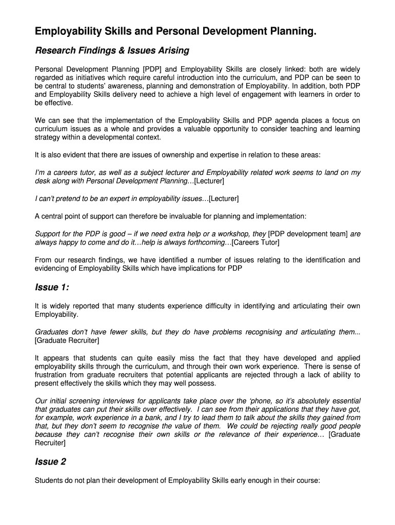 Employability Skills and Personal Development Planning. Research Findings & Issues Arising Personal Development Planning PDP and Employability Skills are closely linked: both are widely regarded as