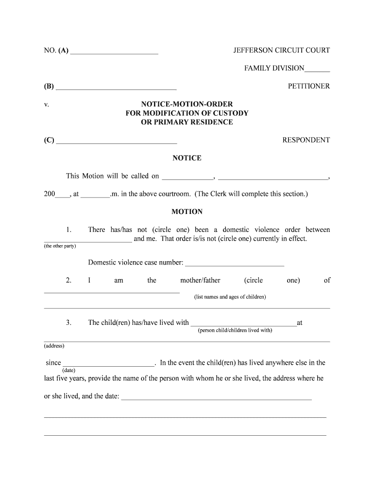 NO. (A) JEFFERSON CIRCUIT COURT FAMILY DIVISION (B) v. PETITIONER NOTICEMOTIONORDER FOR MODIFICATION OF CUSTODY OR PRIMARY RESIDENCE (C) RESPONDENT NOTICE This Motion will be called on, 200, at.m.