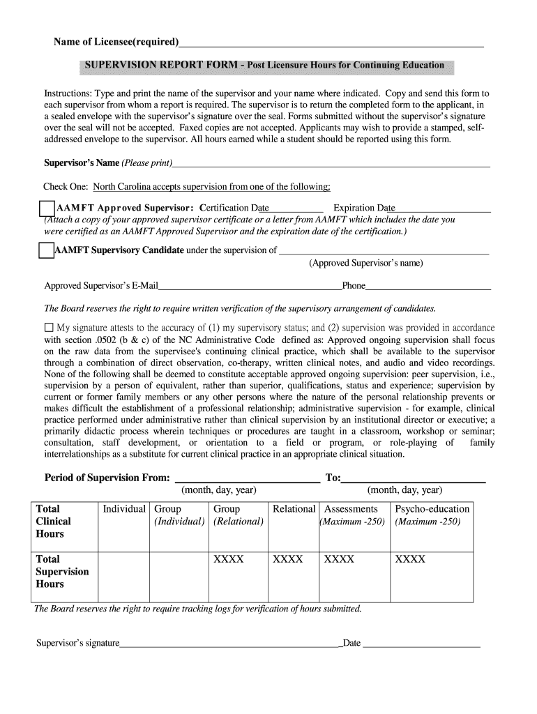 Name of Licensee(required) SUPERVISION REPORT FORM Post Licensure Hours for Continuing Education Instructions: Type and print the name of the supervisor and your name where indicated. Copy and send