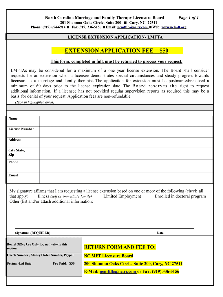 North Carolina Marriage and Family Therapy Licensure Board Page 1 of 1 201 Shannon Oaks Circle, Suite 200 Cary, NC 27511 Phone: (919) 6546914 Fax (919) 3365156 Email: ncmftlb NC.rr.com Web: www.nclmft.org
