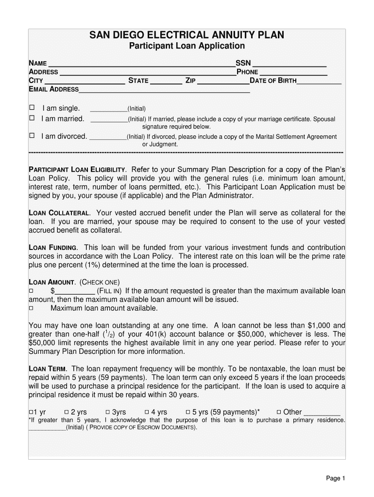 SAN DIEGO ELECTRICAL ANNUITY PLAN Participant Loan Application NAME SSN ADDRESS PHONE CITY STATE ZIP DATE OF BIRTH EMAIL ADDRESS I am single. I am married. (Initial) (Initial) If married, please include