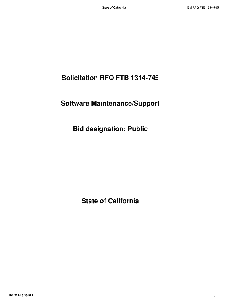 State of California Bid RFQ FT 1314745 5 Solicitation RFQ FT 1314745 Software Maintenance/Support Bid designation: Public State of California 6 5/1/2014 3:33 PM p. 1 State of California Bid RFQ FT