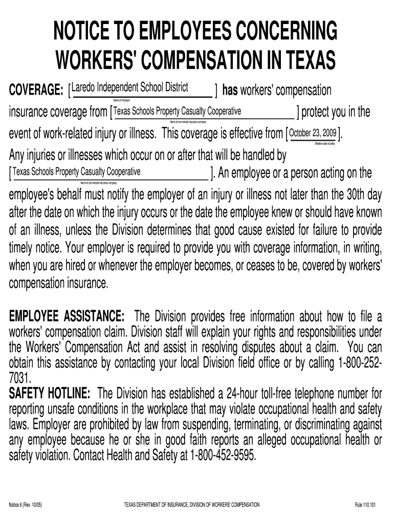 NOTICE TO EMPLOYEES CONCERNING WORKERS COMPENSATION IN TEXAS COVERAGE: Laredo Independent School District has workers compensation insurance coverage from Texas Schools Property Casualty Cooperative