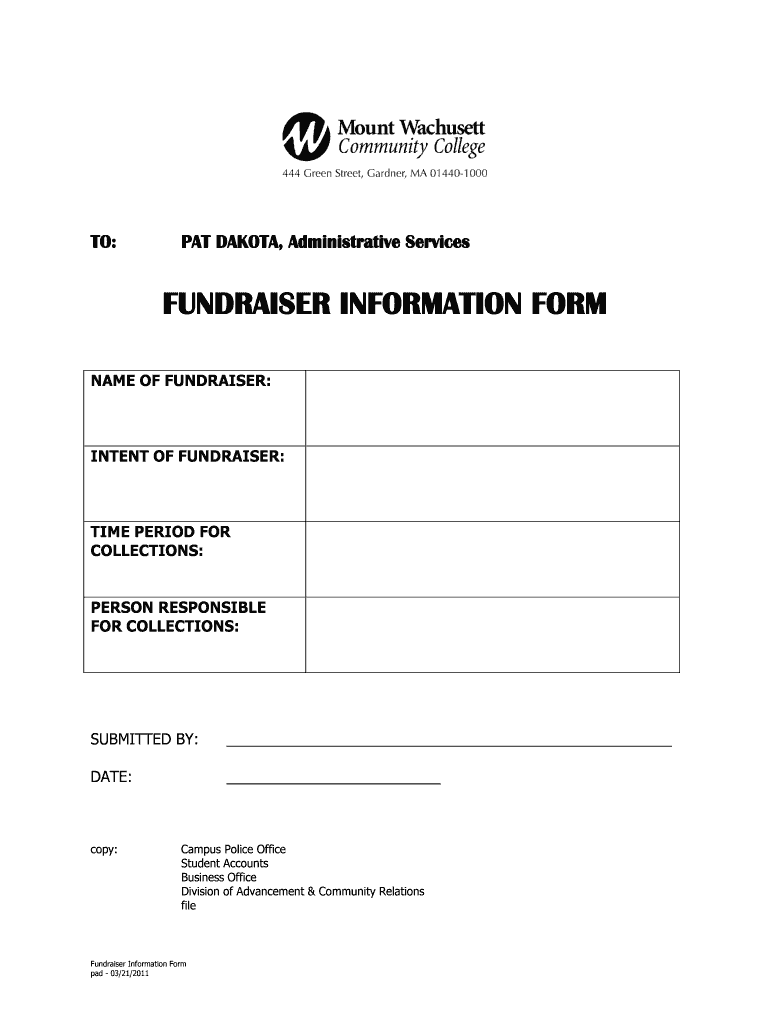 TO: PAT DAKOTA, Administrative Services FUNDRAISER INFORMATION FORM NAME OF FUNDRAISER: INTENT OF FUNDRAISER: TIME PERIOD FOR COLLECTIONS: PERSON RESPONSIBLE FOR COLLECTIONS: SUBMITTED BY: DATE: copy: