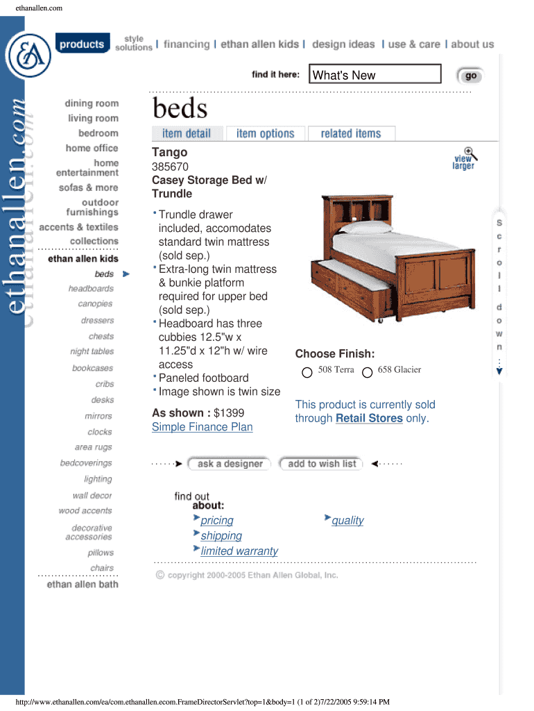 Ethanallen.com What's New Tango 385670 Casey Storage Bed w/ Trundle drawer included, accommodates standard twin mattress (sold SEP.) Extra long twin mattress & junkie platform required for upper bed