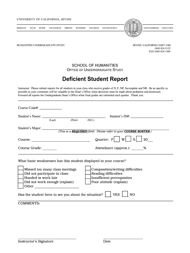 Get the free O UNDERGRADUATE S Deficient Student Report - humanities uci