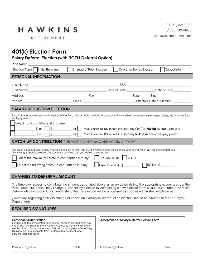 (801) 2241900 (801) 2241930 hawkinsretirement.com 401(k) Election Form Salary Deferral Election (with ROTH Deferral Option) Plan Name: Election Type: Initial Enrollment Change of Prior Election Onetime
