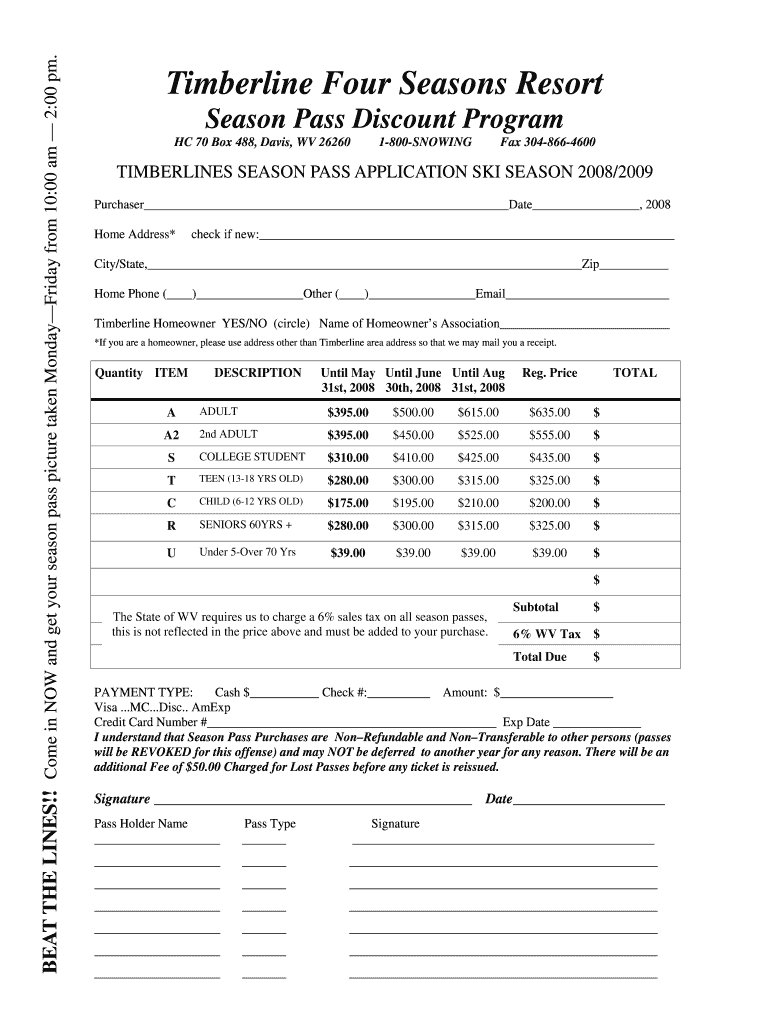BEAT THE LINES!! Come in NOW and get your season pass picture taken Monday Friday from 10:00 am 2:00 pm. Timberline Four Seasons Resort Season Pass Discount Program HC 70 Box 488, Davis, WV 26260