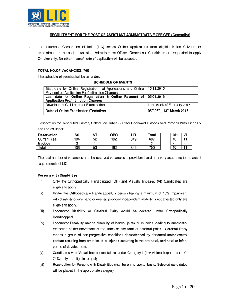 RECRUITMENT FOR THE POST OF ASSISTANT ADMINISTRATIVE OFFICER (Generalist) 1. Life Insurance Corporation of India (LIC) invites Online Applications from eligible Indian Citizens for appointment to