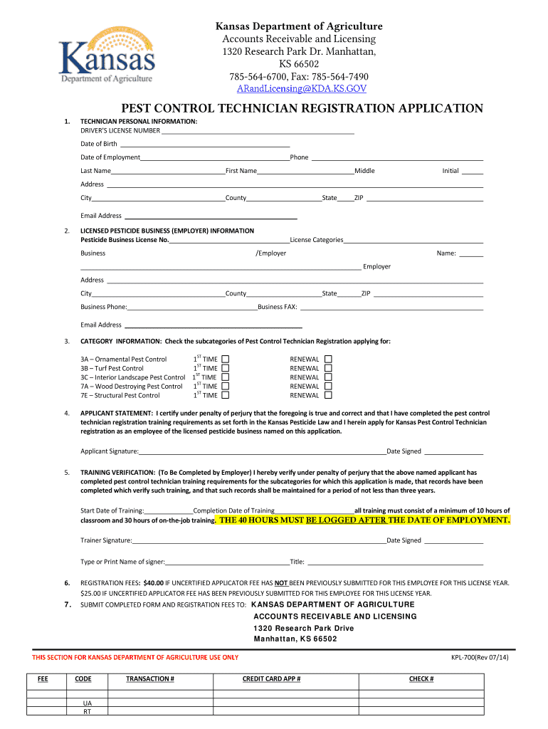 Kansas Department of Agriculture Accounts Receivable and Licensing 1320 Research Park Dr. Manhattan, KS 66502 7855646700, Fax: 7855647490 ARandLicensing DA.KS.GOV PEST CONTROL TECHNICIAN REGISTRATION