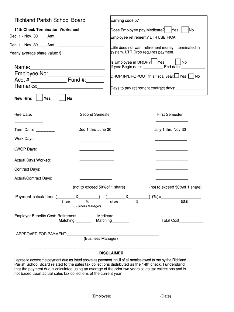 Richland Parish School Board Earning code 57 14th Check Termination Worksheets Does Employee pay Medicare? Dec. 1 Nov. 30 Amt: Dec. 1 Nov. 30 Amt: Yearly average share value: $ Name: Employee No: