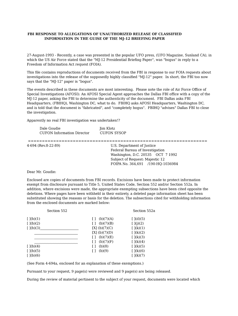 FBI RESPONSE TO ALLEGATIONS OF UNAUTHORIZED RELEASE OF CLASSIFIED INFORMATION IN THE GUISE OF THE MJ12 BRIEFING PAPER 27August1993 Recently, a case was presented in the popular UFO press, (UFO Magazine,