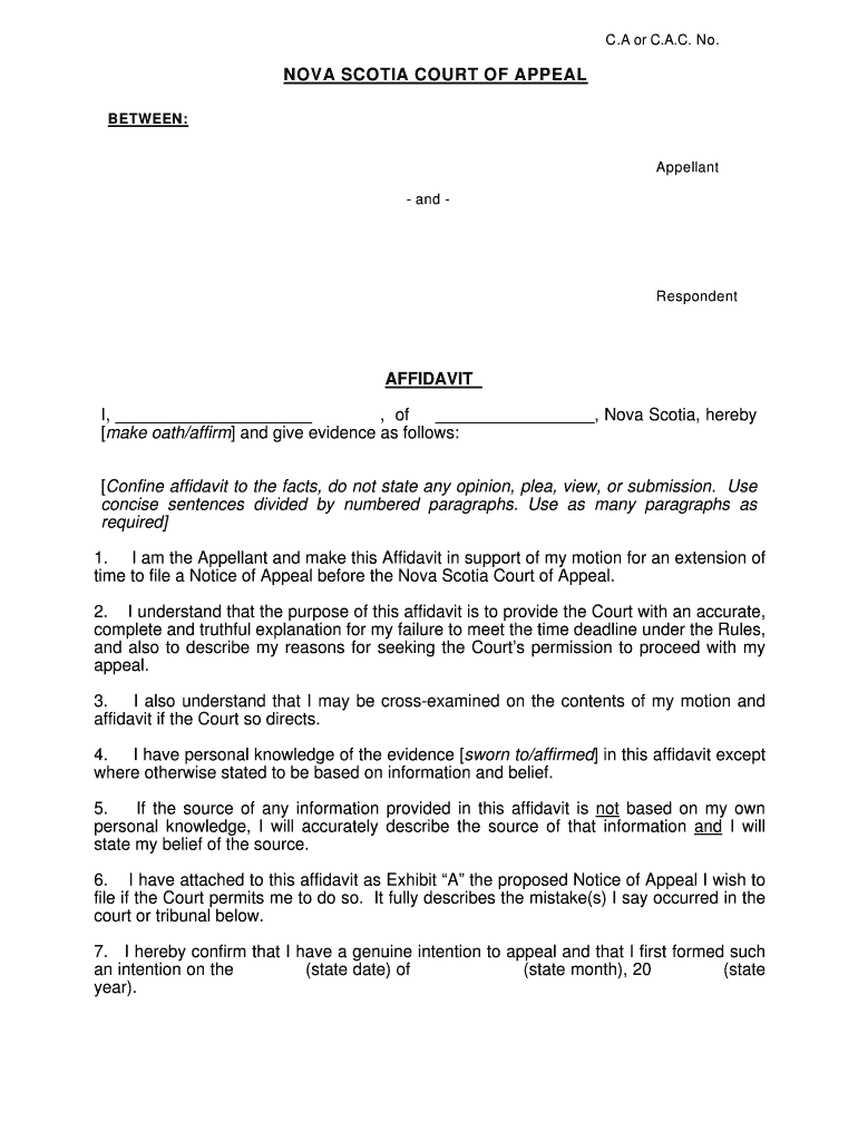 C. A or C.A.C. No. NOVA SCOTIA COURT OF APPEAL BETA E EN: Appellant and Respondent AFFIDAVIT I, of, Nova Scotia, hereby make oath/affirm and give evidence as follows: Confine affidavit to the facts,