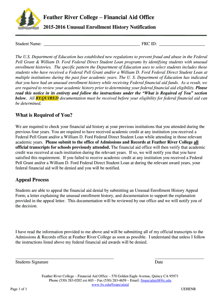 Feather River College Financial Aid Office 20152016 Unusual Enrollment History Notification Student Name: FRC ID: The U.S. Department of Education has established new regulations to prevent fraud