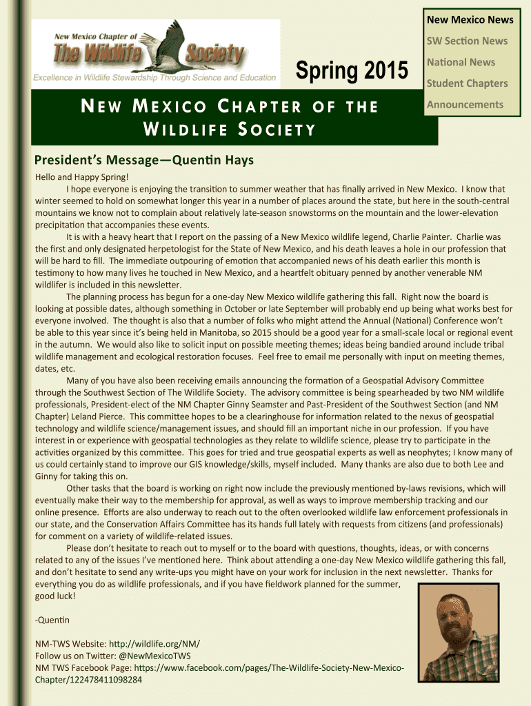 New Mexico News SW Section News Spring 2015 NEW MEXICO CHAPTER OF WILDLIFE SOCIETY THE National News Student Chapters Announcements Presidents Message Quentin Hays Hello and Happy Spring! I hope everyone