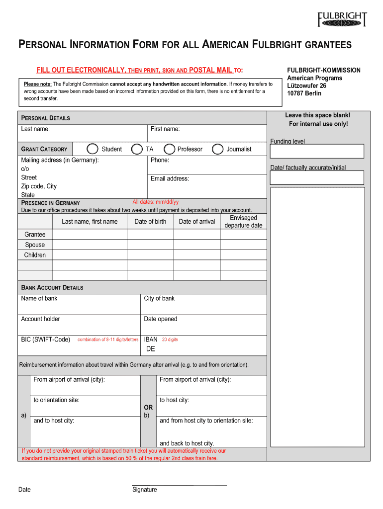 PERSONAL INFORMATION FORM FOR ALL AMERICAN FULBRIGHT GRANTEES FILL OUT ELECTRONICALLY, THEN PRINT, SIGN AND POSTAL MAIL TO: Please note: The Fulbright Commission cannot accept any handwritten account
