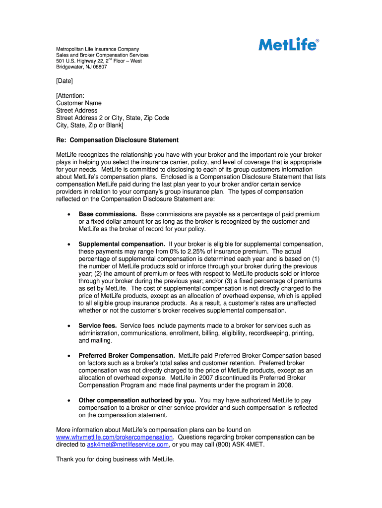 Metropolitan Life Insurance Company Sales and Broker Compensation Services ND 501 U.S. Highway 22, 2 Floor West Bridgewater, NJ 08807 Date Attention: Customer Name Street Address 2 or City, State,