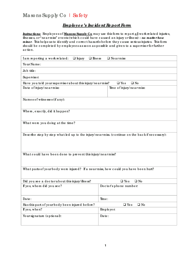 Masons Supply Co Safety Employees Incident Report Form Instructions: Employees of Masons Supply Co may use this form to report all work related injuries, illnesses, or near miss events (which could