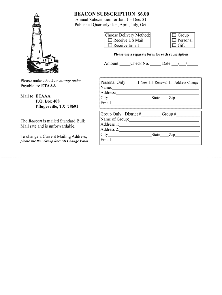 BEACON SUBSCRIPTION $6.00 Annual Subscription for Jan. 1 Dec. 31 Published Quarterly: Jan, April, July, Oct. Please make check or money order