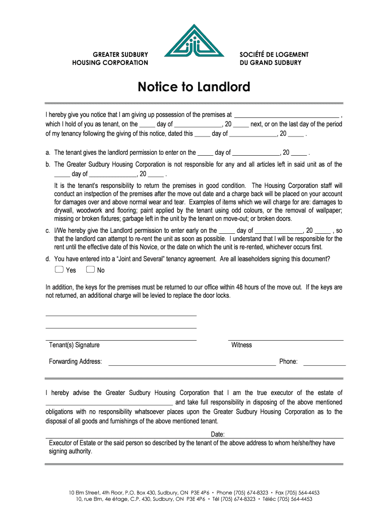 GREATER SUDBURY HOUSING CORPORATION SO CIT DE MOVEMENT DU GRAND SUDBURY Notices to Landlord I hereby give you notice that I am giving up possession of the premises at, which I hold of you as tenant,