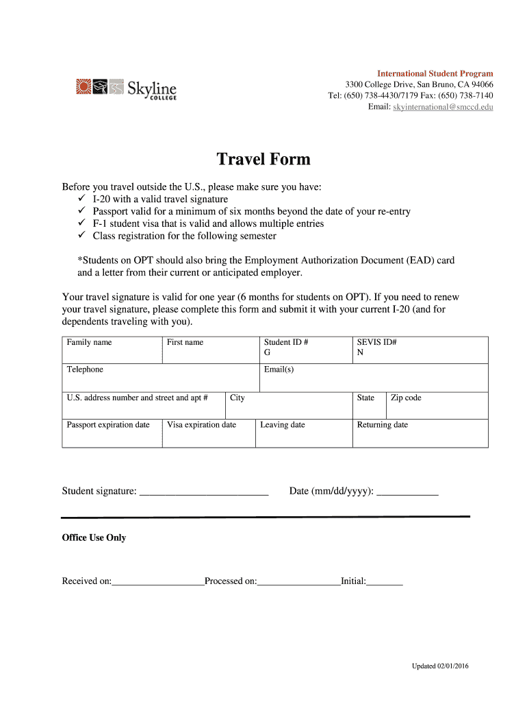 International Student Program 3300 College Drive, San Bruno, CA 94066 Tel: (650) 738-4430/7179 Fax: (650) 738-7140 Email: sky international CCD.edu Travel Form Before you travel outside the U.S.,