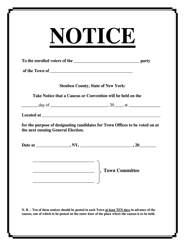 NOTICE To the enrolled voters of the party of the Town of Steuben County, State of New York: Take Notice that a Caucus or Convention will be held on the day of, 20, at Located at for the purpose of