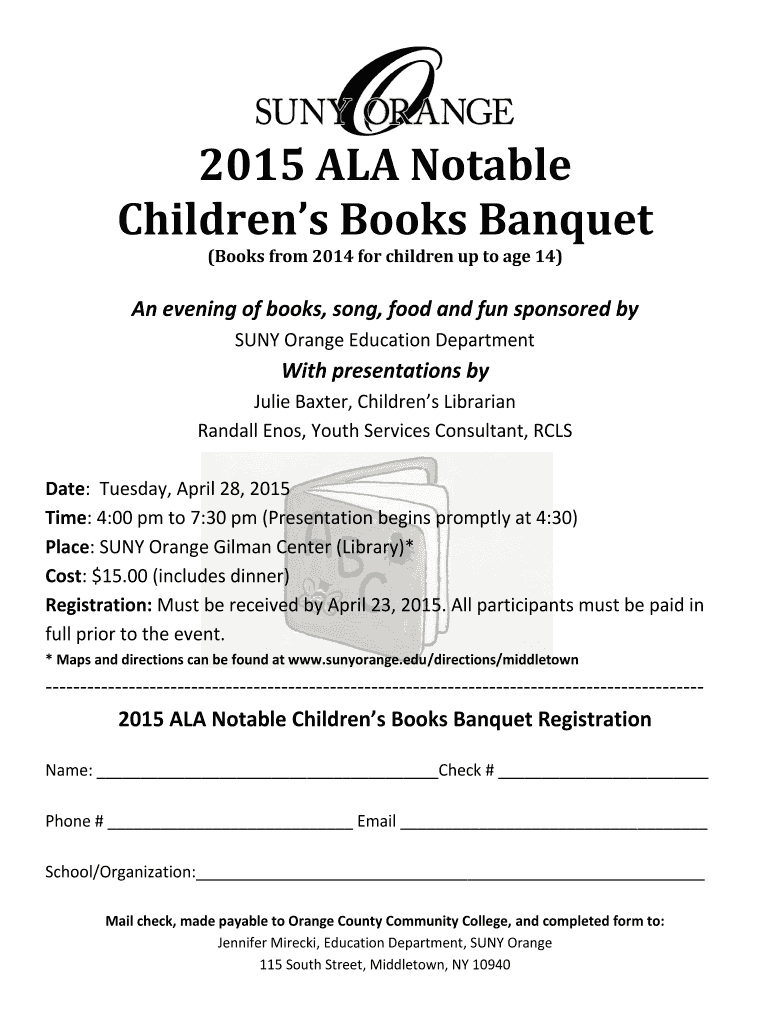 2015 ALA Notable Children's Books Banquet (Books from 2014 for children up to age 14) An evening of books, song, food and fun sponsored by SUN Orange Education Department With presentations by Julie