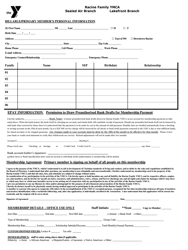 Racine Family YMCA Sealed Air Branch Lakefront Branch BILLABLE/PRIMARY MEMBERS PERSONAL INFORMATION (0) First Name MI Last M F Birth Date / / East of I94 Address Downtown Racine City State Zip Code