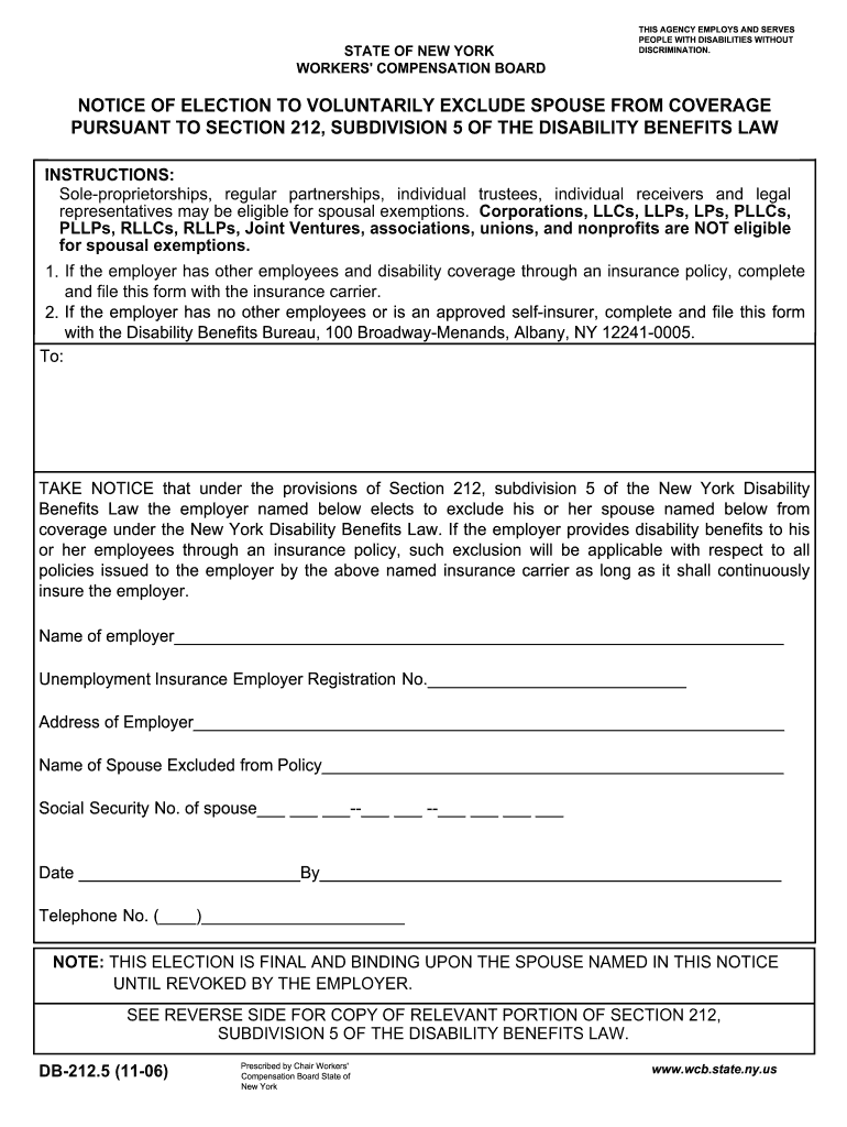 STATE OF NEW YORK WORKERS' COMPENSATION BOARD THIS AGENCY EMPLOYS AND SERVES PEOPLE WITH DISABILITIES WITHOUT DISCRIMINATION. NOTICE OF ELECTION TO VOLUNTARILY EXCLUDE SPOUSE FROM COVERAGE PURSUANT