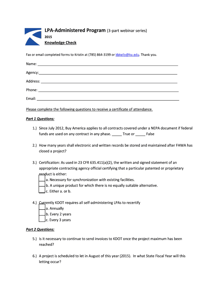 Administered Program (3part webinar series) 2015 Knowledge Check Fax or email completed forms to Kristin at (785) 8643199 or Kelly KU.edu. Thank you. Name: Agency: Address: Phone: Email: Please complete