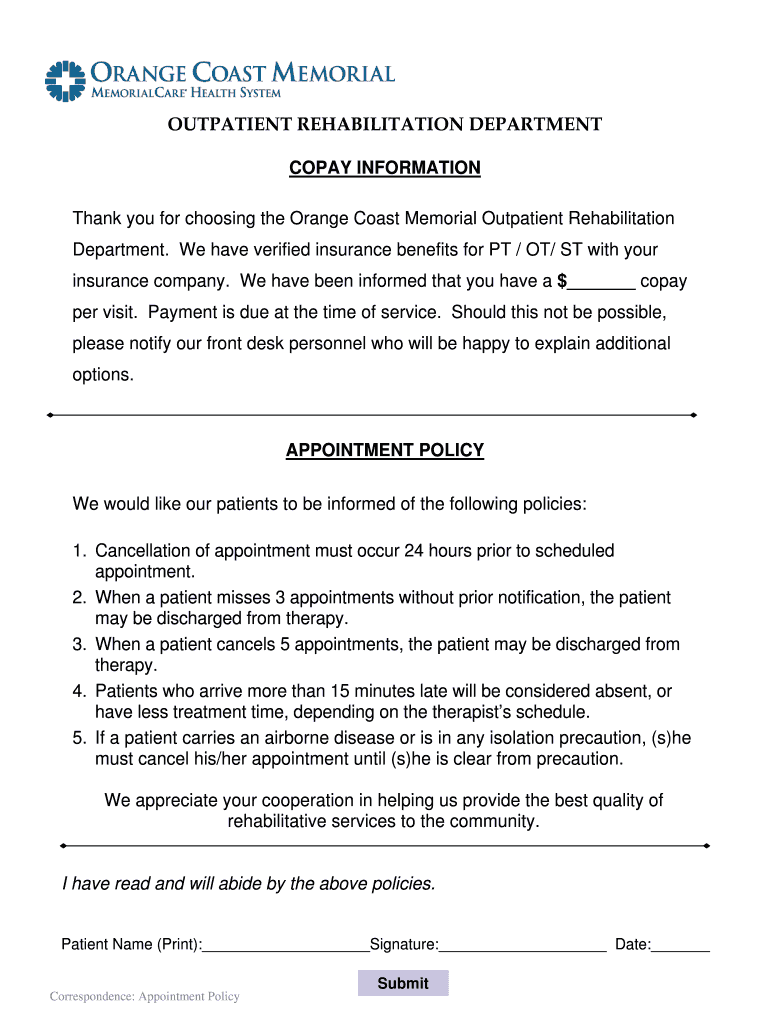 OUTPATIENT REHABILITATION DEPARTMENT COPAY INFORMATION Thank you for choosing the Orange Coast Memorial Outpatient Rehabilitation Department. We have verified insurance benefits for PT / OT/ ST with