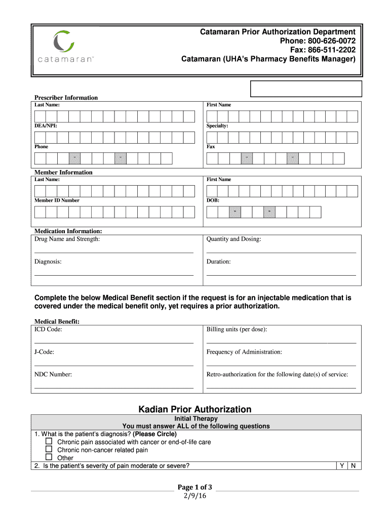 Catamaran Prior Authorization Department Phone: 8006260072 Fax: 8665112202 Catamaran (Has Pharmacy Benefits Manager) Prescriber Information Last Name: First Name DEA/NPI: Specialty: Phone Fax Member