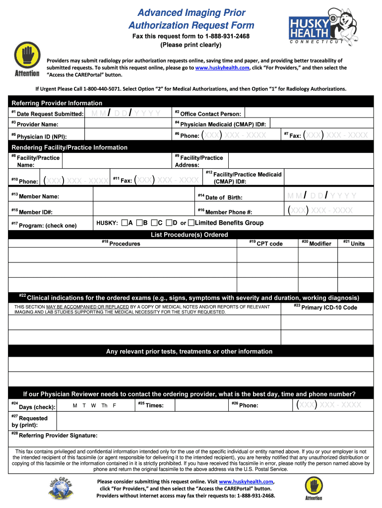 Advanced Imaging Prior Authorization Request Form Fax this request form to 1-888-931-2468 (Please print clearly) Providers may submit radiology prior authorization requests online, saving time and