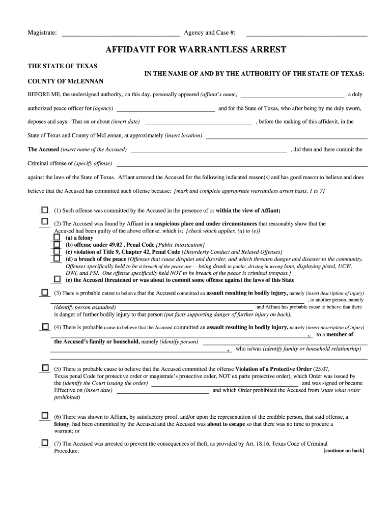 Magistrate: Agency and Case #: AFFIDAVIT FOR WARRANTLESS ARREST THE STATE OF TEXAS IN THE NAME OF AND BY THE AUTHORITY OF THE STATE OF TEXAS: COUNTY OF McLennan BEFORE ME, the undersigned authority,