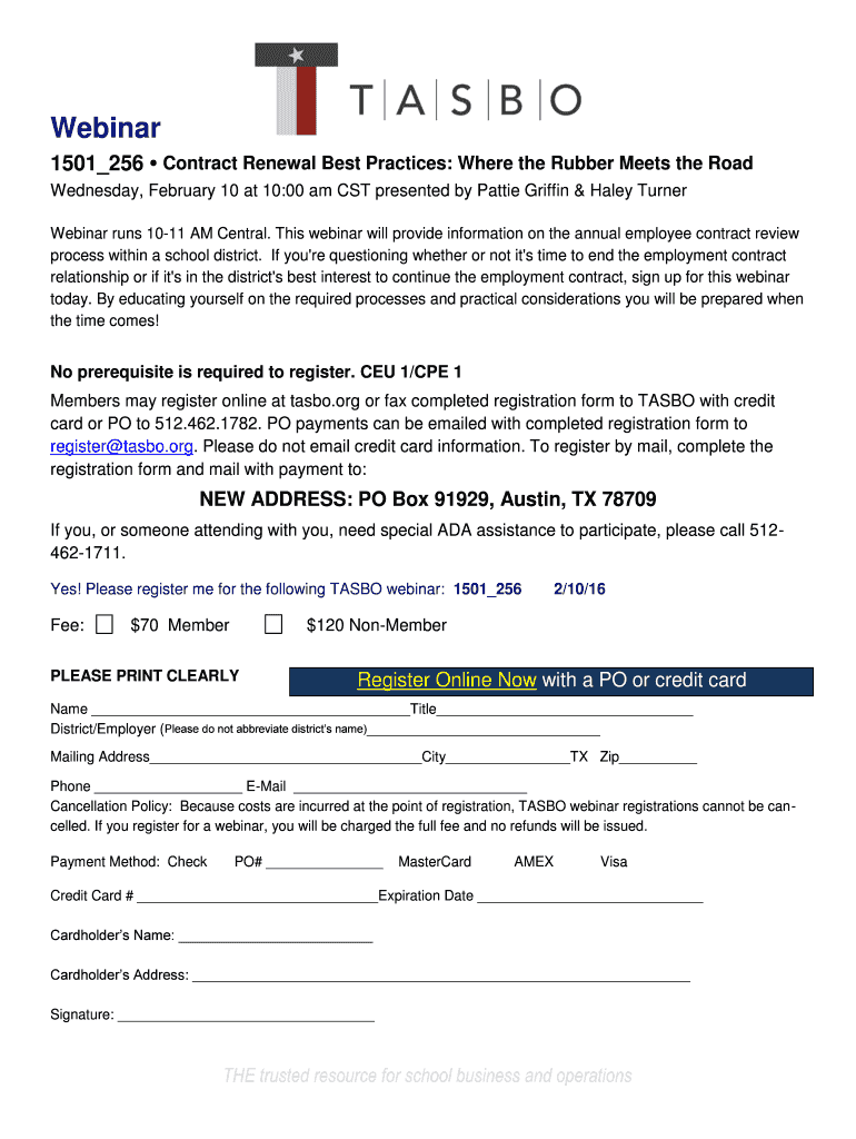 Webinar 1501 256 Contract Renewal Best Practices: Where the Rubber Meets the Road Wednesday, February 10 at 10:00 am CST presented by Pattie Griffin & Haley Turner Webinar runs 1011 AM Central. This