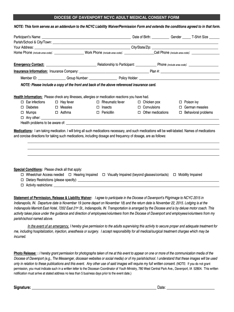 DIOCESE OF DAVENPORT NYC ADULT MEDICAL CONSENT FORM NOTE: This form serves as an addendum to the NYC Liability Waiver/Permission Form and extends the conditions agreed to in that form. Participants