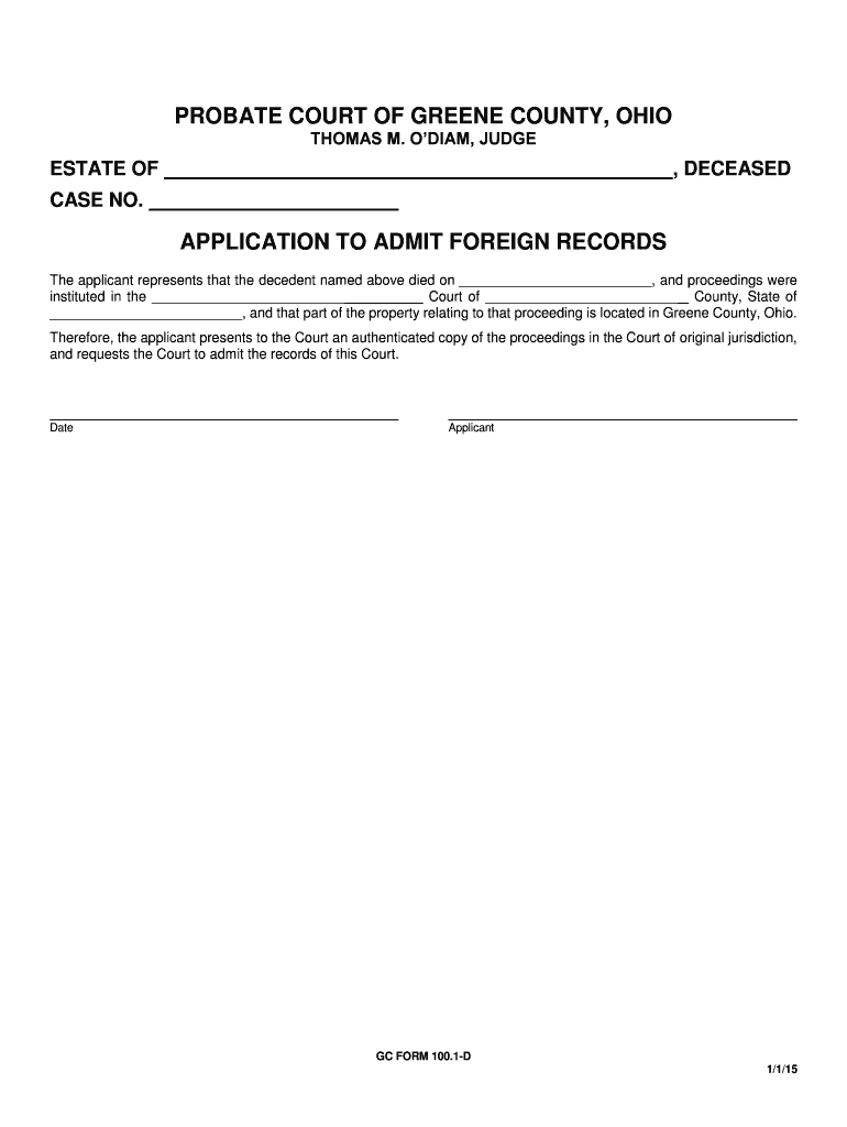 PROBATE COURT OF GREENE COUNTY, OHIO THOMAS M. ODIUM, JUDGE ESTATE OF, DECEASED CASE NO. APPLICATION TO ADMIT FOREIGN RECORDS The applicant represents that the decedent named above died on, and proceedings