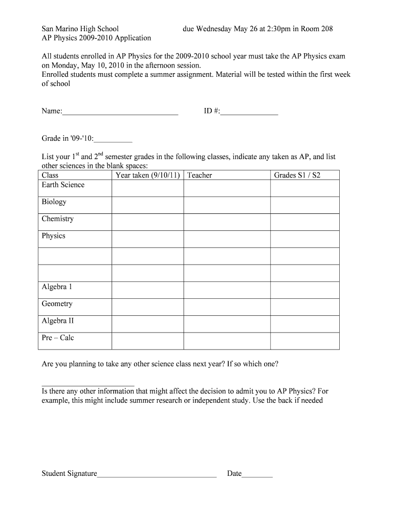 San Marino High School AP Physics 20092010 Application due Wednesday, May 26 at 2:30pm in Room 208 All students enrolled in AP Physics for the 20092010 school year must take the AP Physics exam on