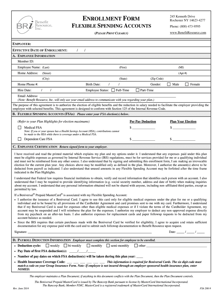 245 Kenneth Drive Rochester NY 146234277 ENROLLMENT FORM FLEXIBLE SPENDING ACCOUNTS Phone: (800) 4739595 www.BenefitResource.com (PLEASE PRINT CLEARLY) EMPLOYER: EFFECTIVE DATE OF ENROLLMENT: A. EMPLOYEE
